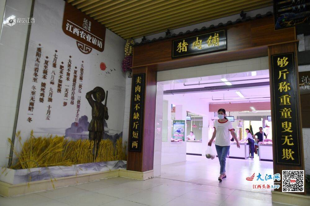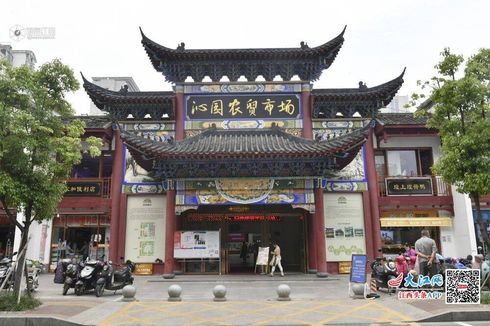 5月14日,南昌市红谷滩新区沁园农贸市场,市民正在干净、整洁、敞亮的环境中购物。该市场分上下两层,蔬菜、水果、肉铺、副食品都划定好各自区域。市场内还增设了扶贫助农平台摊位、生活便民摊位,如缝纫铺、小家电修理铺等,身处其中感觉就像在一个环境舒适的大型商超,“让人有了五星级的买菜体验。”记者了解,该市场今年初开业以来,已经成了备受市民喜爱的“网红”农贸市场。新市场建筑占地约7443平方米分为上下两层,经营面积1万余平,设置摊位478个。有机动车及非机动车泊位530余个。据了解,沁园农贸市场内的大部分商家均来自此前的红谷八路露天菜市场。“以前的露天菜市场环境很差,特别是下雨天,就更脏了,”一位摊主告诉记者,根据政府统一规范管理的要求,他们搬到了沁园农贸市场,“环境好了,买菜的市民也更愿意来了,生意自然更好了”。图为仿古建筑的菜场大门。 中国江西网/江西头条客户端 记者 王祺 摄 实习生 陈凌志