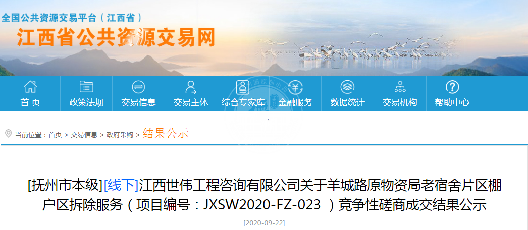 日前,抚报君在江西省公共资源交易网注意到:羊城路原物资局老宿舍片区棚户区已发布了拆除服务竞争性磋商成交结果公示!