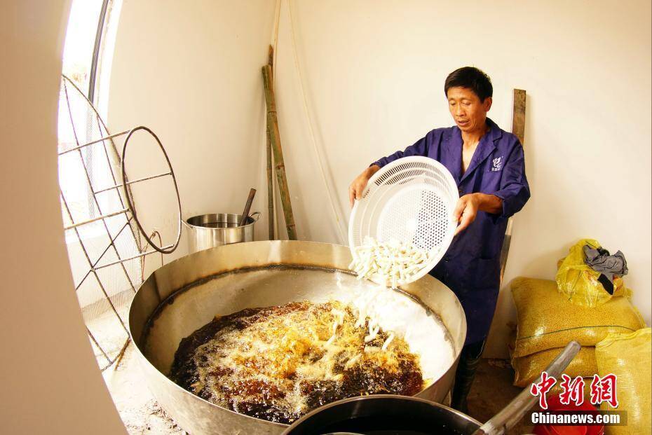 余传太将炸好的豆参装入袋中。 王昊阳 摄