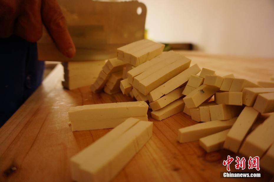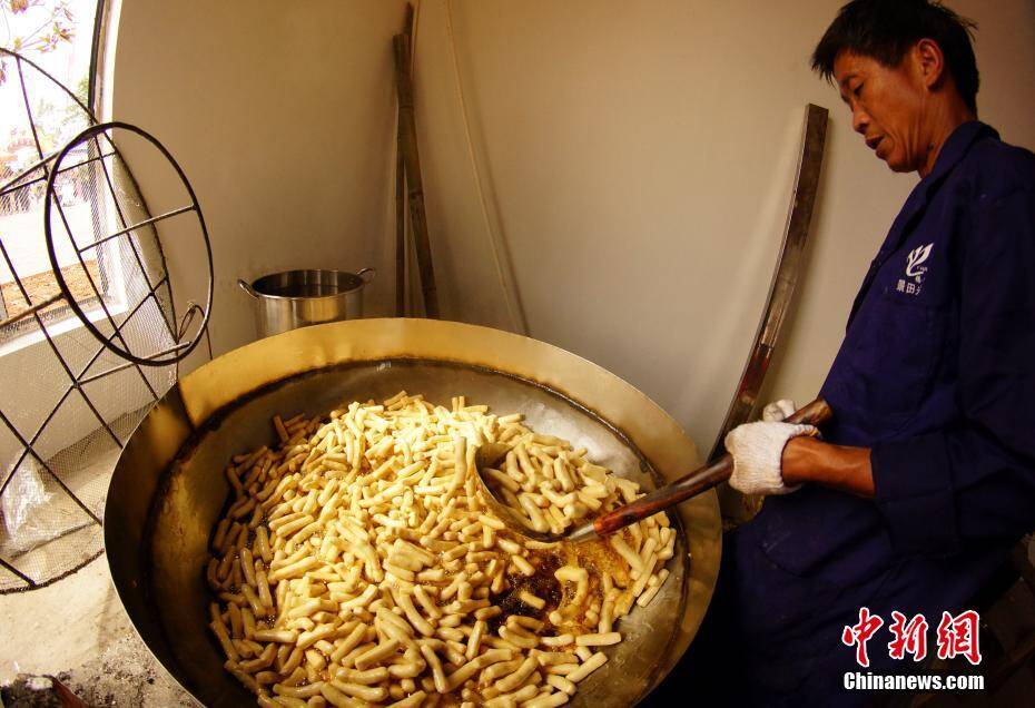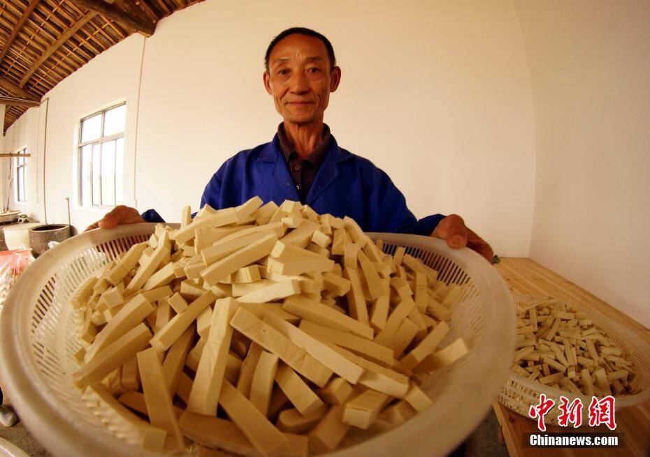 南峰豆参以当地盛产的黄豆为原料,先将黄豆制作成豆腐,把豆腐压紧成豆干,再将榨干水份的豆干切成条状,将豆条放入油锅煎炸。 王昊阳 摄