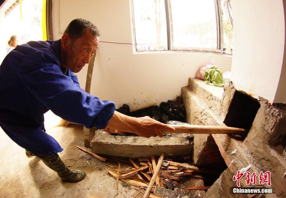余传太在向炉灶内添加柴火。土灶柴火、纯菜籽油、本地大豆原料,是南峰豆参保持最佳味道的关键要素。 王昊阳 摄