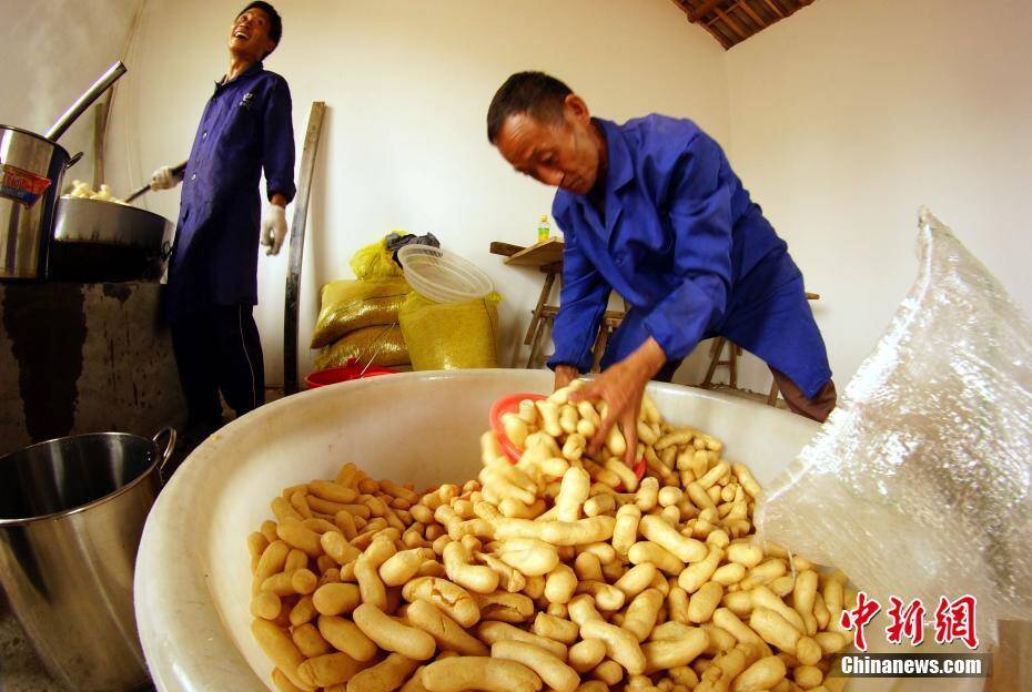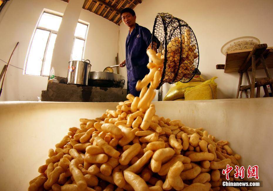 豆条经过高温油炸,逐渐膨胀,变成圆柱状,成为色泽金黄的豆参。 王昊阳 摄