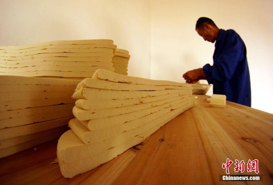 在鄱阳湖畔的江西省都昌县,制作特色食品“豆参”有数百年历史。以优质大豆制成豆干,再用菜籽油炸熟,成为色泽金黄、营养丰富的豆参,可作为炒菜或煮汤的辅料,是当地每家每户过年必备食材。都昌年产豆参数十万斤,畅销周边景德镇、南昌等地。都昌豆参以南峰镇所产为最佳,南峰人余传太、余传习兄弟二人从事豆参加工40年,是当地远近闻名的豆参制作能手。图为5月19日,江西省都昌县南峰镇,余传太在制作豆参。 王昊阳 摄