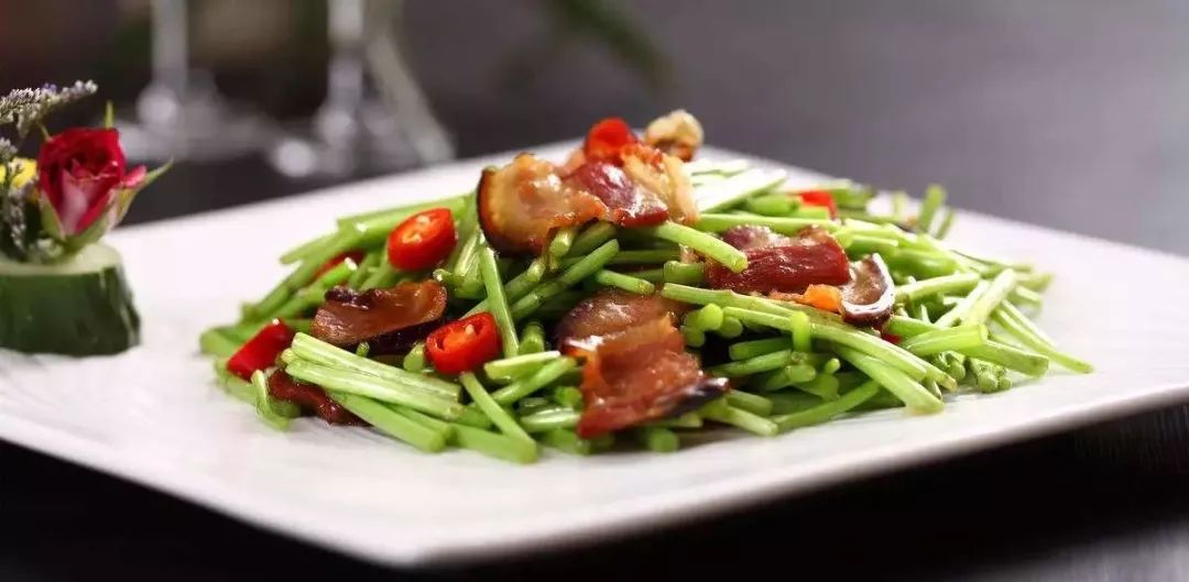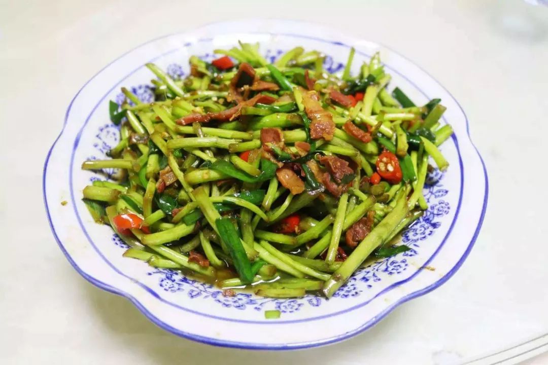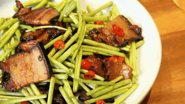 咸香柔软的腊肉,愈发衬出藜蒿特立独行的香气。藜蒿如青丝带,嫩绿中发亮,腊肉金红微白,黄绿相间,观之令人食欲顿增。