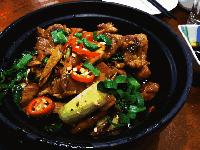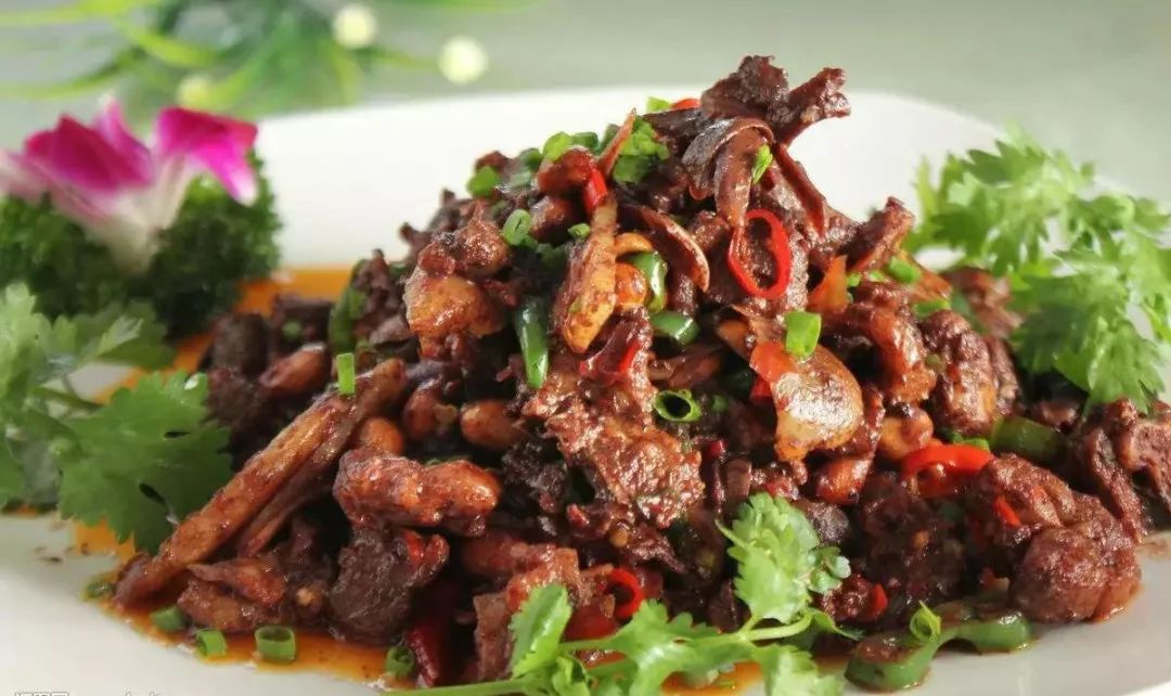 莲花血鸭色泽紫红油亮,鸭肉脆嫩,味鲜辣可口,备受食客的青睐。